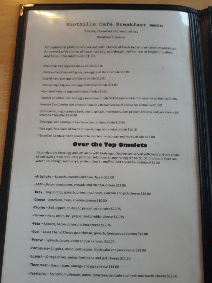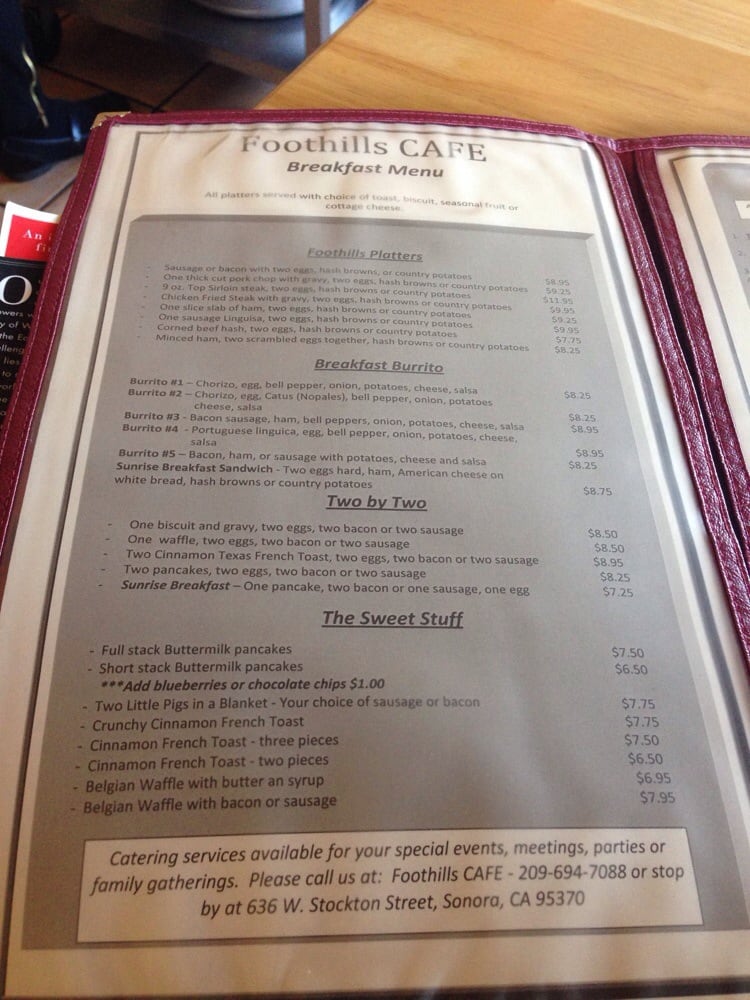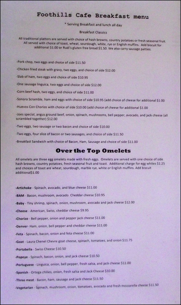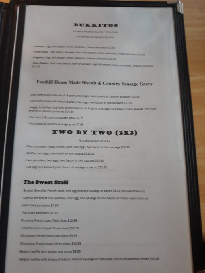 Foothills Cafe in Sonora, CA offers a cozy breakfast and brunch experience with a wide range of menu options. Customers rave about the generous portions, fresh ingredients, and friendly service. The owner, Violet, is praised for her hospitality and personal touch, making diners feel right at home. Highlights include the spicy chicken fried steak with delicious gravy, eggs, hash browns, and toast, as well as the waffles, French toast, and breakfast burritos. The cafe also offers vegan and vegetarian options, catering services, and outdoor seating. With excellent food, good coffee, and welcoming staff, Foothills Cafe is a must-visit for a satisfying homestyle breakfast in a charming setting.